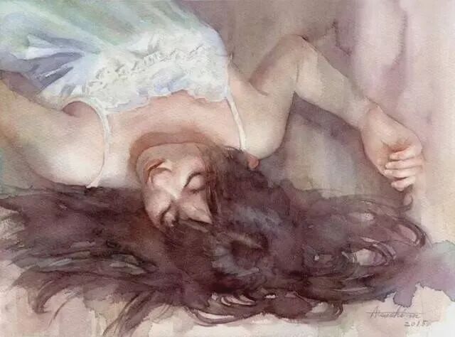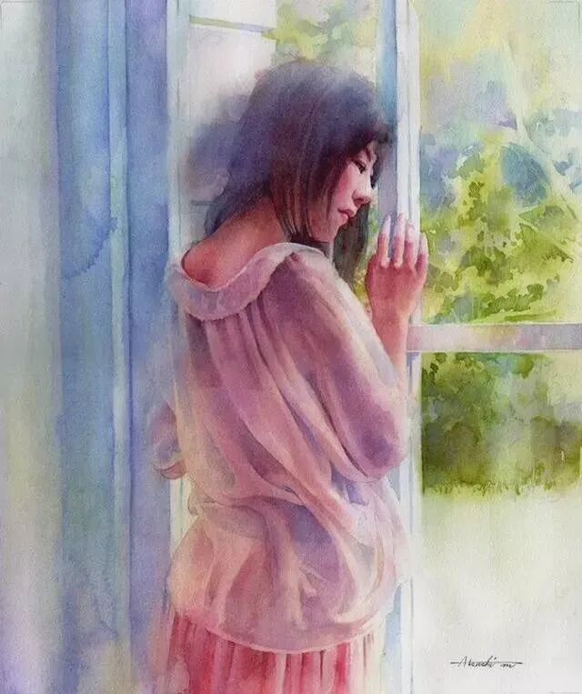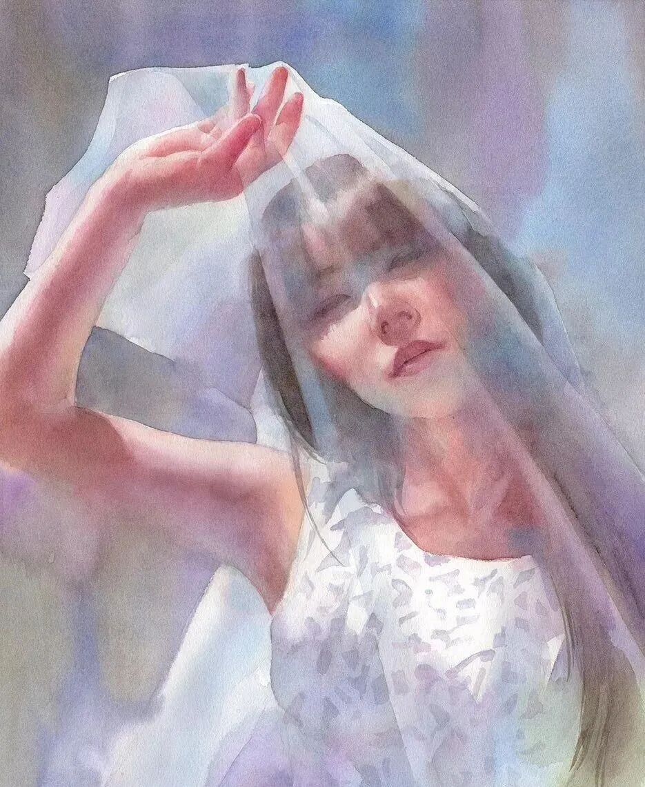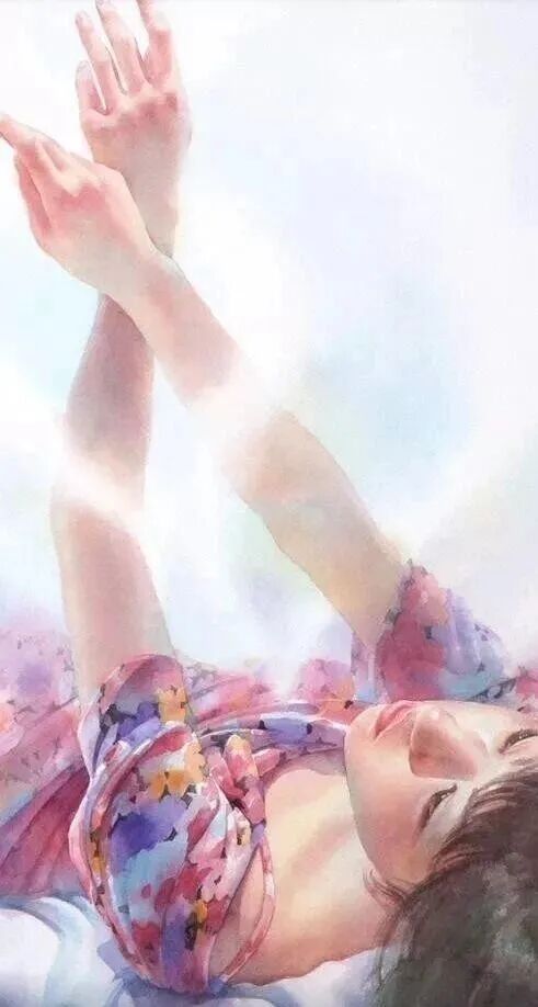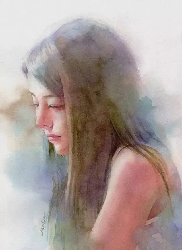 松林淳朦胧透明空灵的水彩画,展现了少女的柔美和灵动的神韵,如出浴的美人,欲遮还羞,甚是动人,让观赏者充分享受少女时代的美好时光!