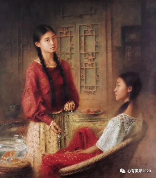 自古江南女子温润如玉,他笔下的很多女性人物形象,似乎都来自于我们身边的邻家女孩,温润、细腻、端庄,淡然超脱,但又那么令人感到亲切美好,优雅恬静!