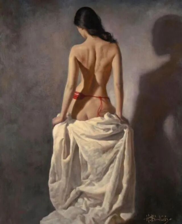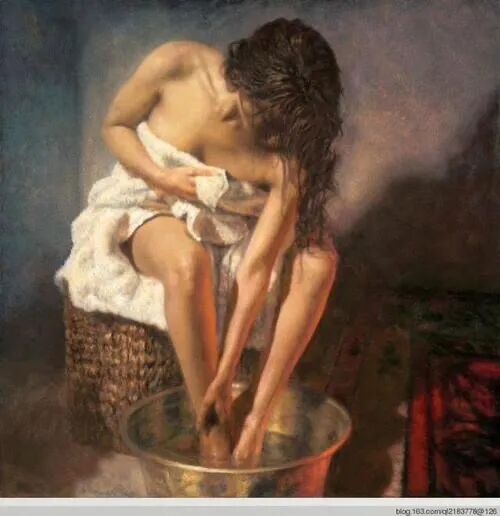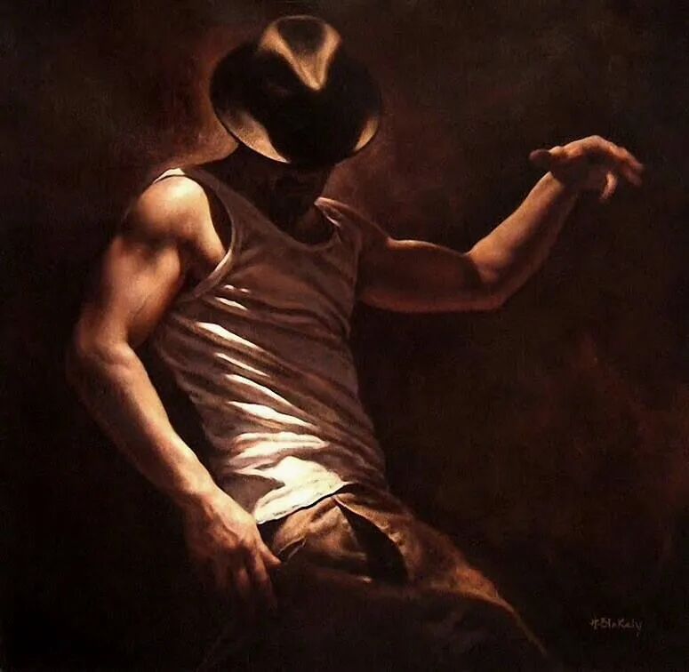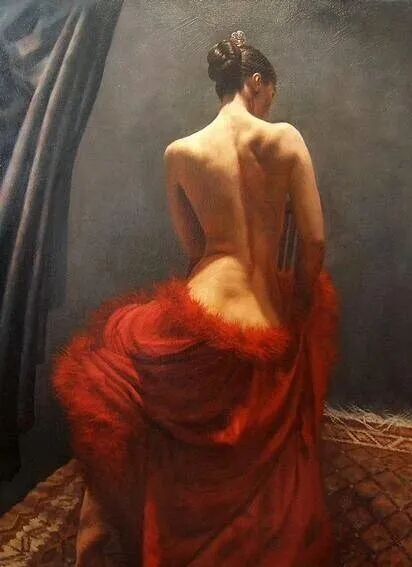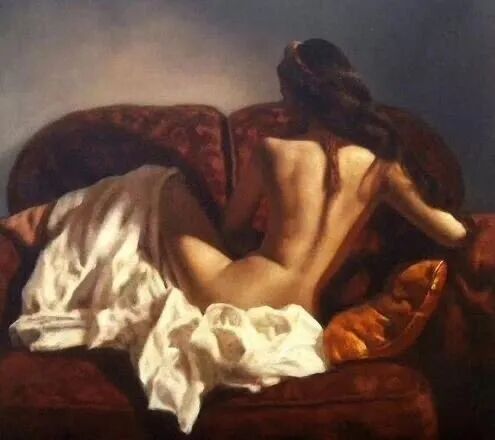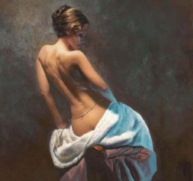 他创作的很多油画,背景昏暗,借此渲染了人物形象的激情、神秘感和肌肉的张力!女人体充满了阳刚之气,又不失女性的曲线之美,男人体则有阴柔之魅力,画面又都是描绘的背部,观赏者无法看清面部表情,但我们可以从其肢体的动作,来了解其感情的起伏与波澜!
