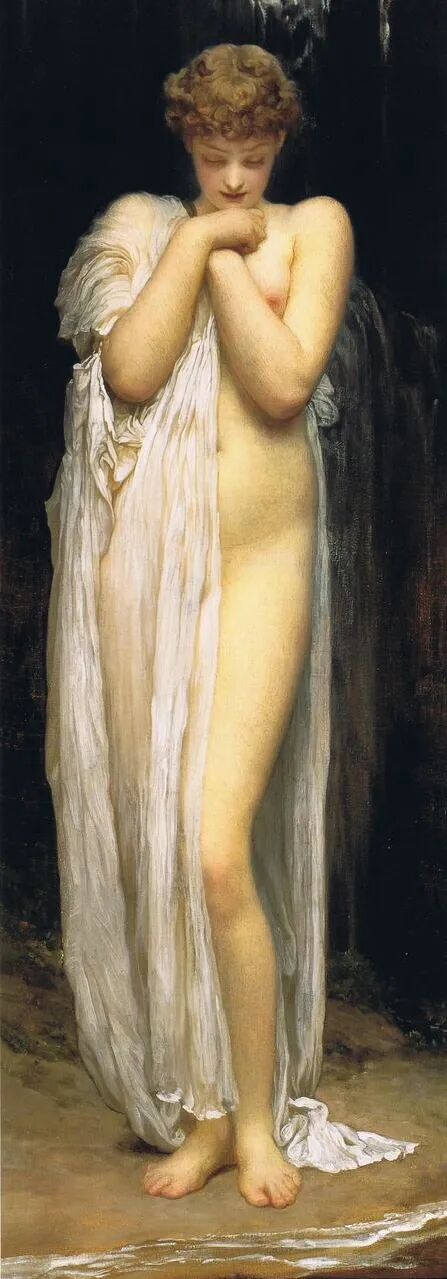 这是英国画家弗雷德里克·莱顿于1880年创作的布面油画,取名《克琳娜·达格尔的宁芙女神》,画中的水宁芙站在瀑布前,正羞涩地展示着修长的身姿!
