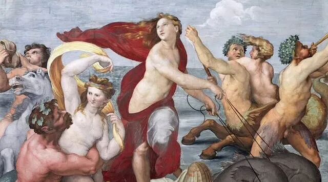 意大利画家弗朗西斯科·阿尔巴尼创作的《乘坐贝壳中的海洋仙子伽拉忒亚》,画中塑造了一位丰腴性感的宁芙—海洋女神!