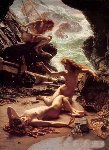 法国画家爱德华·约翰·波因特油画作品《风暴山洞里的宁芙》,岩洞里三位宁芙,一个躺在地上摆弄着财宝,另两位姿势也很不雅观,有一种女妖的感觉,又有点像女海盗、女土匪!