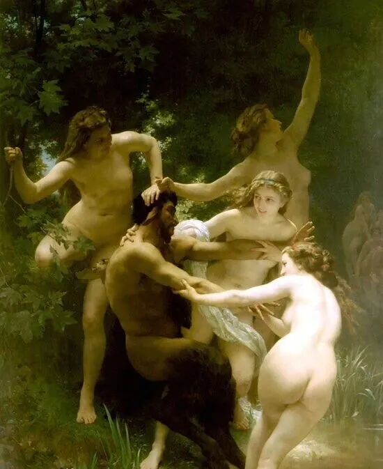 这是布格罗创作的《宁芙与萨堤尔》,这幅作品描述宁芙们在洗澡时,半人半兽的萨堤尔在偷看,他被发现了,于是仙女们把他也拖下水去,一起玩耍的情景。