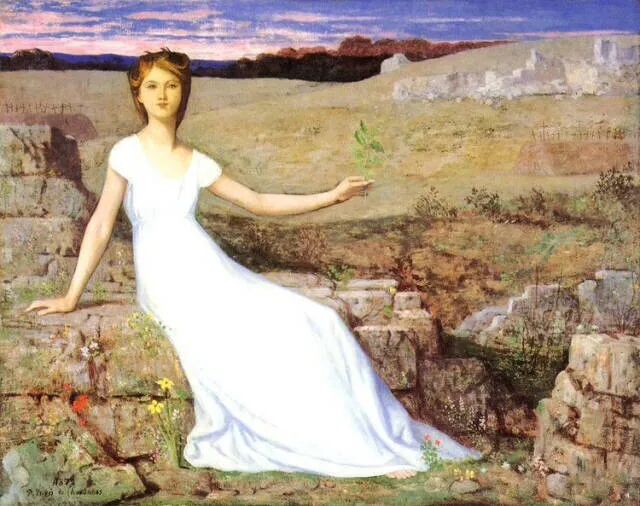 莱顿还画了一幅站立在海边的宁芙,取名《宁芙的海岸》,朝阳初升,一位白衣少女,侧靠在大海的岩石上,眼神平静如水,温柔精美,背后是深蓝的大海和逐渐染红的天空!画家借海宁芙女神,描绘了此时平静的海面!