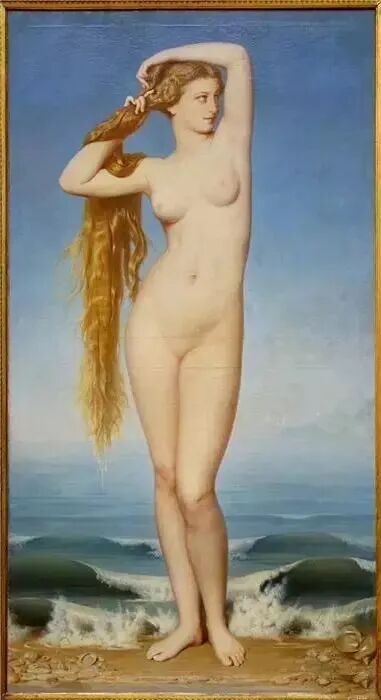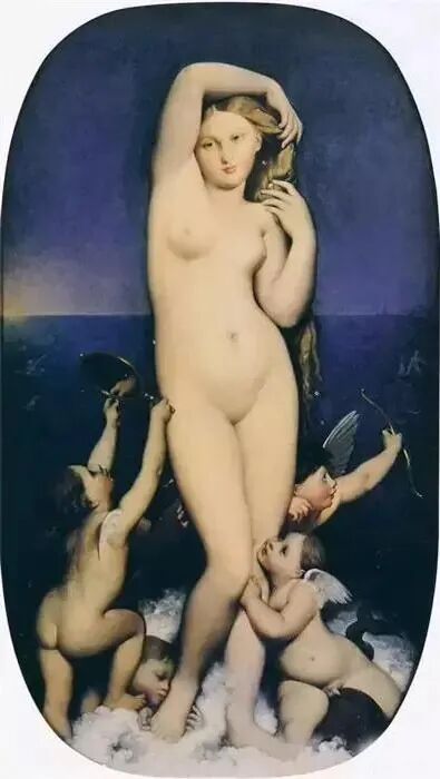 很多西方艺术家都以各种方式塑造了维纳斯,如安格尔《阿纳底奥门的维纳斯》,充满展示了女人的曲线美,其神情姿态最为动人!这幅作品和他创作的《泉》中的少女,其构图形象差不多!据说这部作品完成后,出现了五个买主,争相购买他的这幅画,可见这幅画的魅力以及轰动效应!