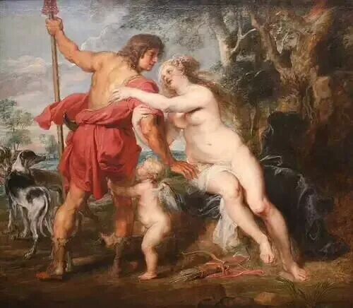 维纳斯的情人还不止一个,她还爱上了一个拥有着绝世美颜的男子阿多尼斯!在提香1553年创作的《维纳斯与美少年》 这幅作品中,就是描述了维纳斯正在用尽方法挽留阿多尼斯,可这位美少年似乎并没有被美色诱惑,在竭力挣脱美人的环抱!