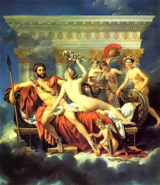 大卫1824年创作的《被维纳斯解除武装的战神马尔斯》 ,其画面就是描述了维纳斯俘获了战神马尔斯的心,为了情人而丢盔弃甲,失去了战斗力!