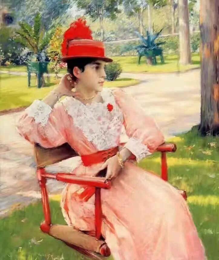 如这幅坐在绿油油草坪上的女子,此时阳光明媚,蓝天白云,春风吹拂,百花齐放,她身穿粉色连衣裙,头戴红色礼帽,一只手臂随意靠在椅子上,托着后脑勺,眼神明亮清澈,和周围生机勃勃的大自然,合为一体,是那么优雅,仪态万方,动人心弦!