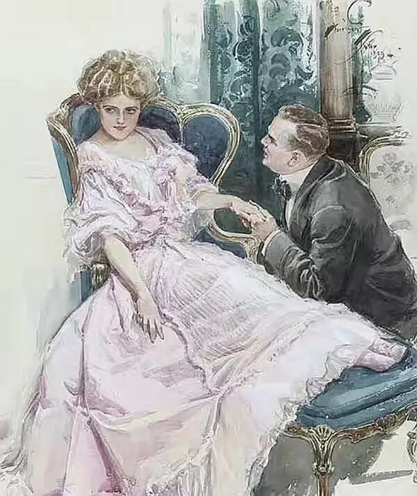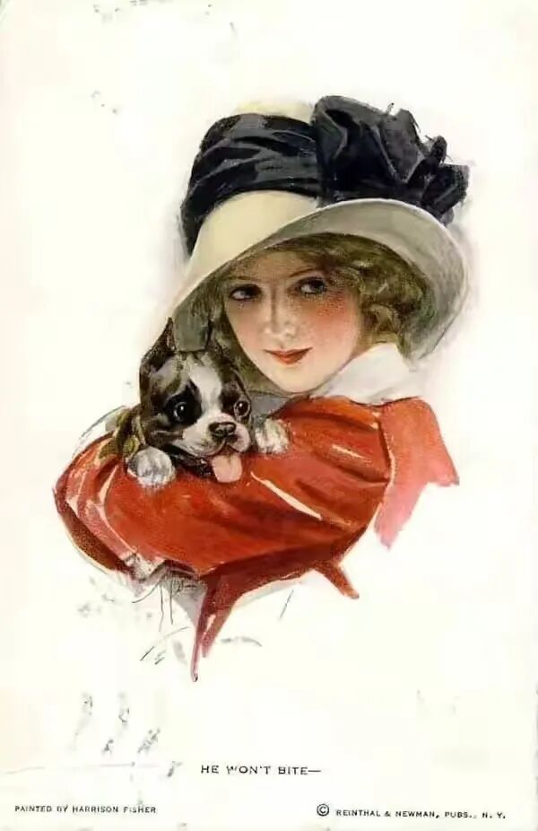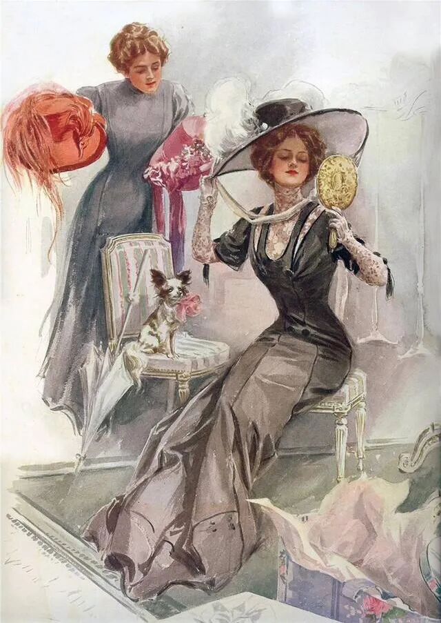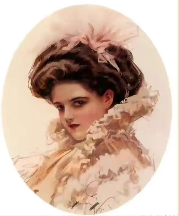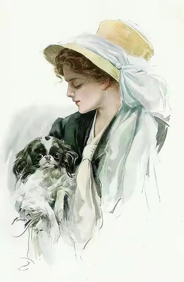 费舍尔非常擅于给画面留白,这使他笔下的女儿们有了不同的身份,以及千人千面的性格!很多画面都出现了不同的头饰,还有宠物狗、宠物猫等,这又给这些夫人们增添了各种不同的高贵的身份!谁会没事遛狗玩猫呢,自然是那些有钱的太太小姐了!