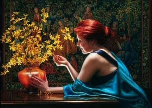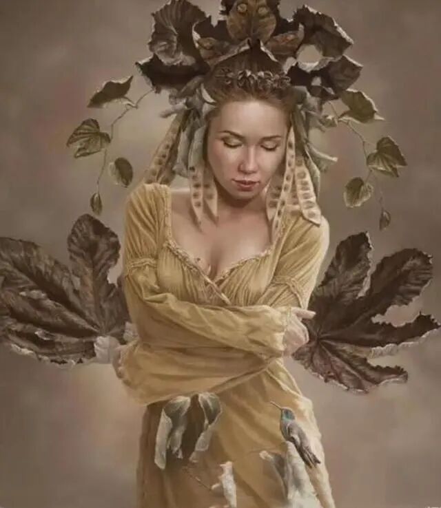 如这幅女孩和许多枯叶放在一起,不知道是不是寓意着今天青春活力的女子,有一天也会成为枯枝败叶,还是女孩利用自己的活力赋予叶子于生机,也或者是四季轮回,落叶其实就是孕育着新生!