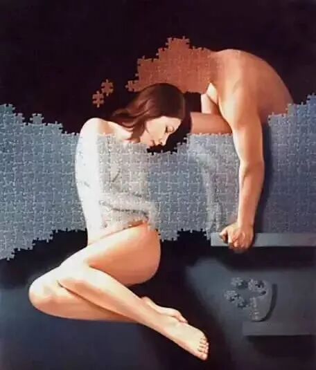 这幅画中的两个男子,为何捏合在一起,我们也许可以理解为,一个外在的他,一个内在的他,那哪一个是他真实的自己呢,这是现实生活中一种撕裂的煎熬吧!