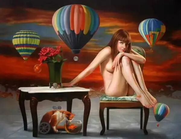 如这幅桌子下面一只猫在聚精会神观看缸里游动的金鱼,它觉得很好玩,而坐在椅子上的女孩神情很微妙,带着一点俏皮可爱捉摸不透的神情!画中上方漂浮着很多氢气球,这两者之间,有什么必然的联系吗!