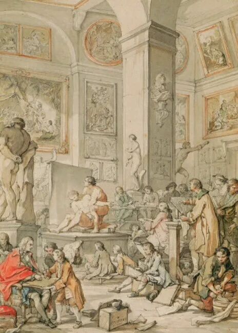 这幅是纳托尔1746年创作的《皇家绘画与雕塑学院生活课》,现藏于伦敦考陶尔德画廊,模特们在台上摆好古典而浪漫的姿势,学生们正在临摹!