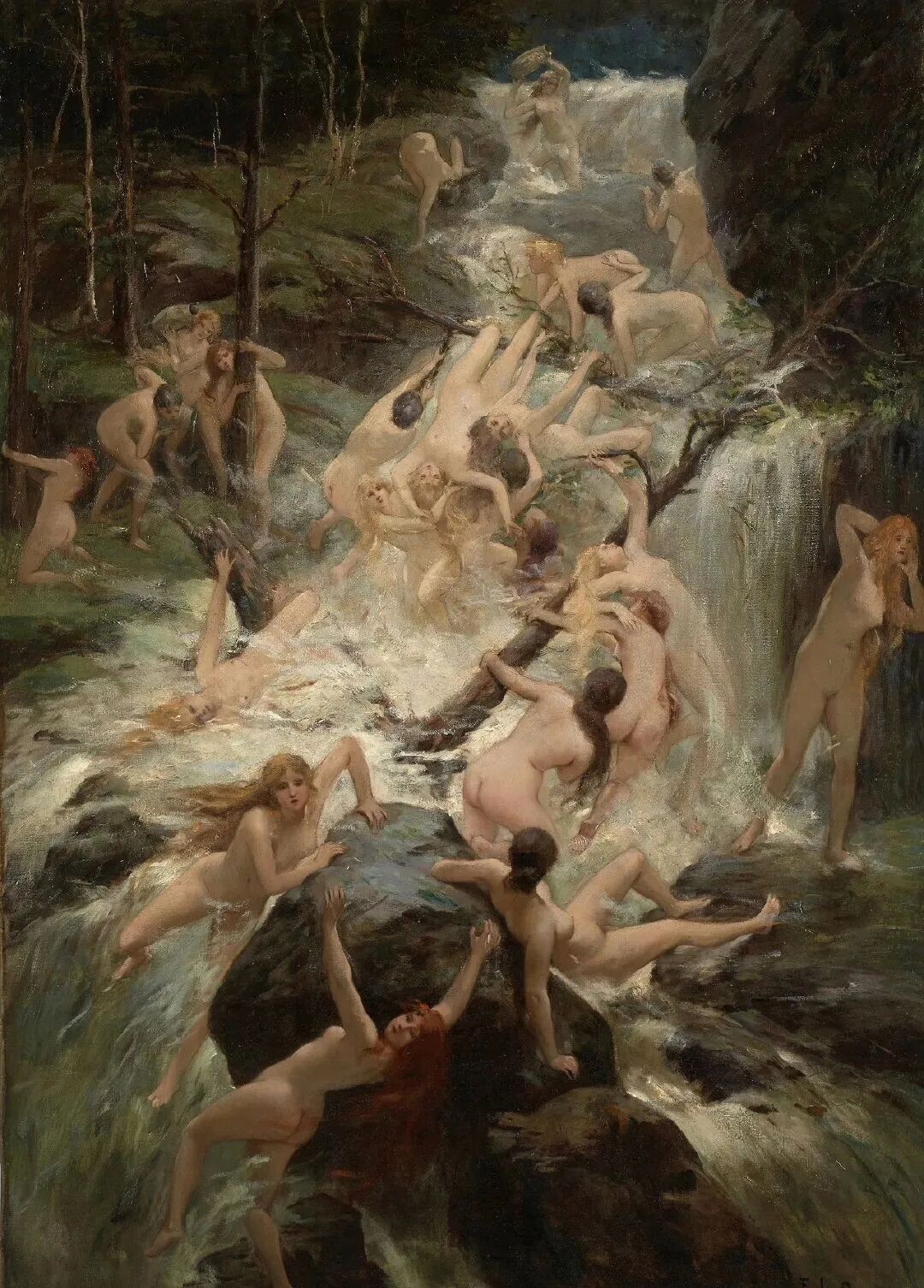 让观者看来,简直不是在描绘千钧一发的逃难,而是利用奔腾不息的河流,突出美女们洁白无瑕光滑细腻的肌肤,千姿百态的形体美!
