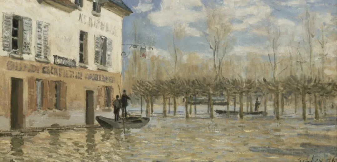 阿尔弗莱德·西斯莱创作的《马利港洪水中的小舟》,画家没有描绘泛滥的洪水,也没有描绘洪水泛滥时那惊心动魄的场面,也没有表现无情的天灾,而是展现了灾难之后的诗意!远处一叶小舟,是希望的小船,是诺亚方舟!