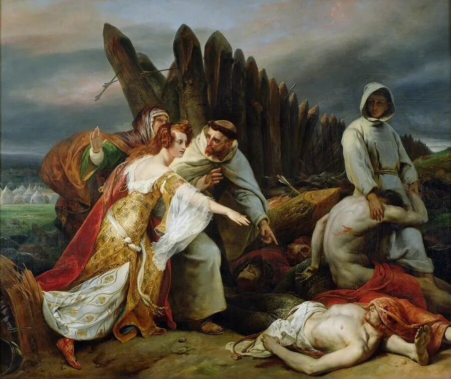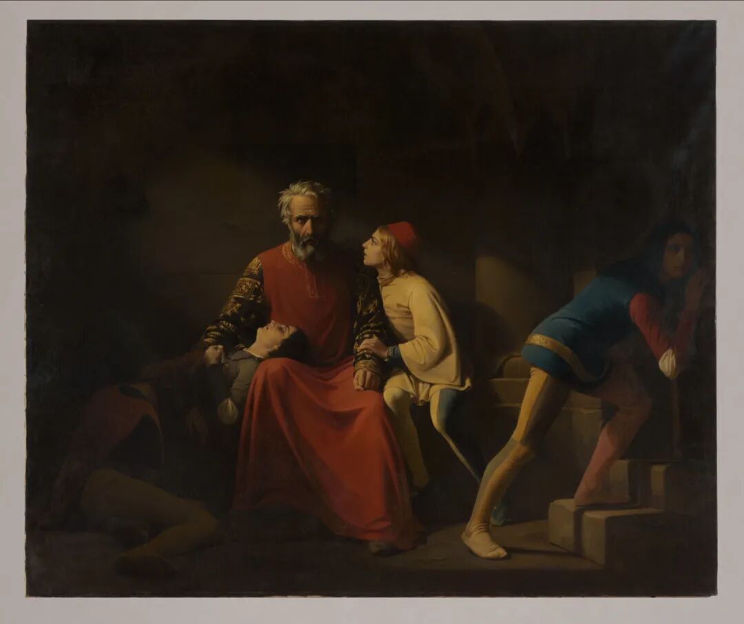 这幅取材于1848年名作《乌格里诺和他的孩子们》,来自于但丁的《神曲》!讲述的是意大利贵族乌格里诺遭陷害,他和孩子们被关入高塔,将活活饿死,最终饥饿压倒了一切,乌格里诺吃了自己孩子们的遗体。