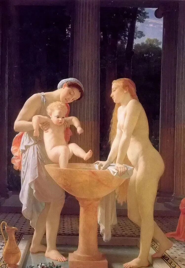 如格莱尔1868年创作的这幅《浴室》,画面唯美和谐,但感觉又很生动有趣活泼!体态婀娜、肤白貌美的母亲,活泼可爱调皮的孩子,还有窗外那一抹云彩,这一切是那么温情感人,感觉人世间最美的风景就是这种幸福的画面了!
