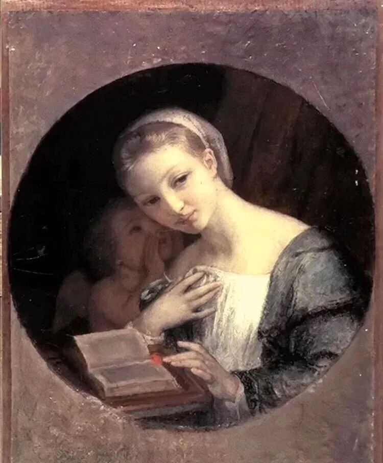 这幅母子图,读书的母亲,凑到母亲耳边说悄悄话的孩童,同样让人感觉幸福满满,但愿这种快乐时光永不流逝!