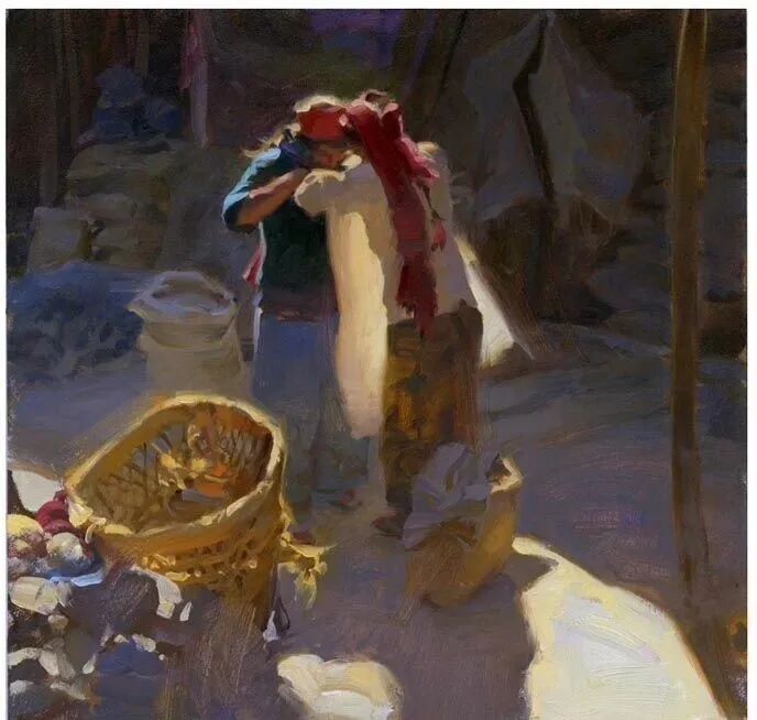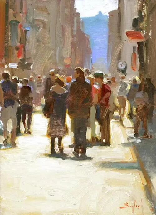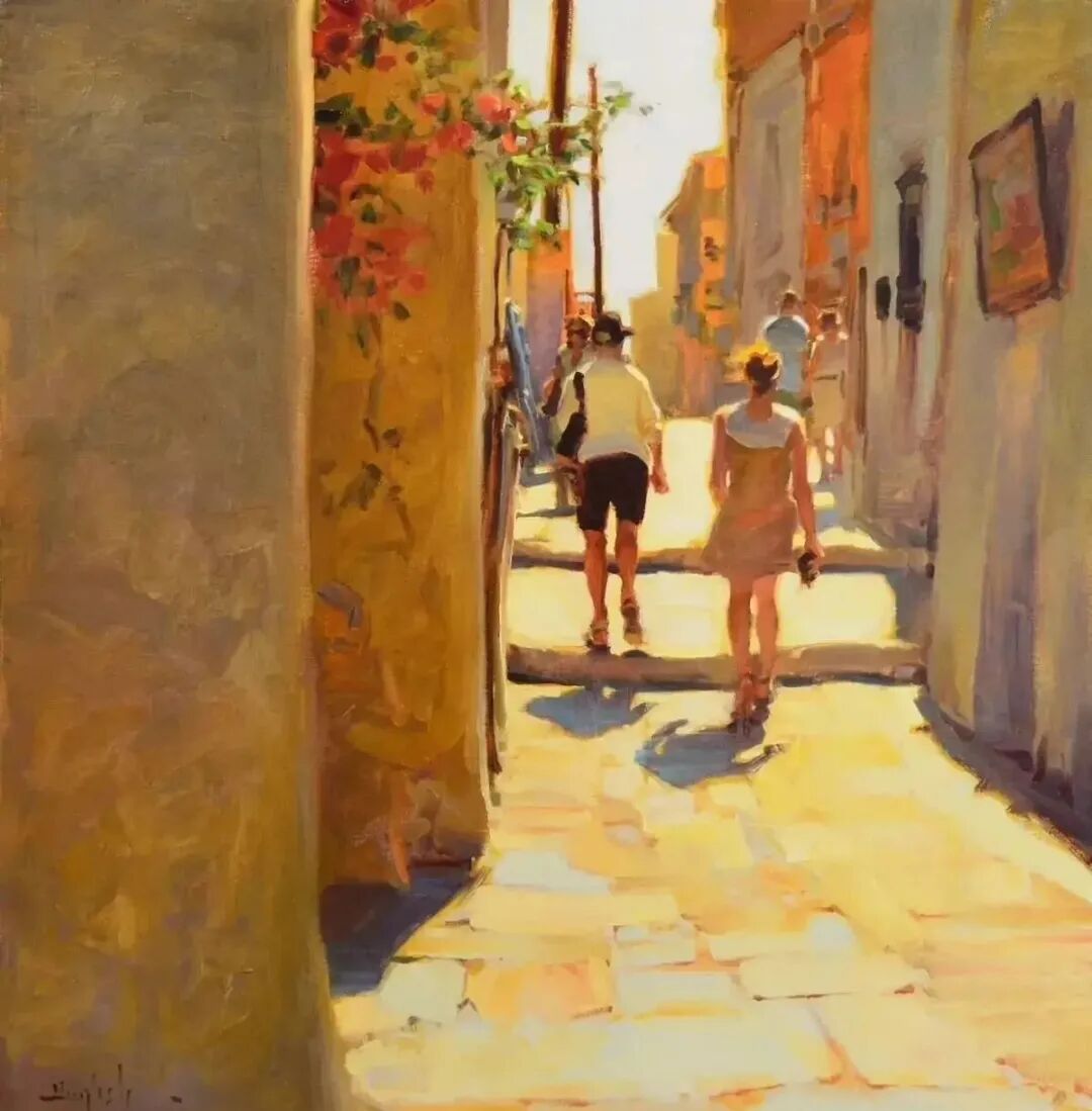 尘世间的世俗生活,人来人往,车水马龙,熙熙攘攘,恩恩爱爱卿卿我我,一起喝茶聊天聚会,一起谈笑风生,一起走过千山万水,这一切在画家的笔下显得温暖而忙碌,美好而诗意!