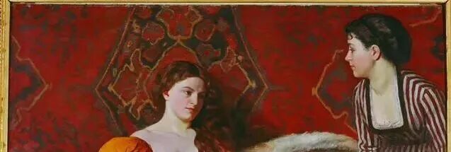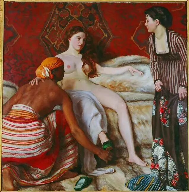 这幅《晨妆》,感觉和安格尔的《土耳其浴女》有异曲同工之妙,具有异域风情的东方情调,也是反应上流社会奢靡享受的闺房生活!