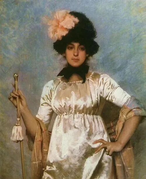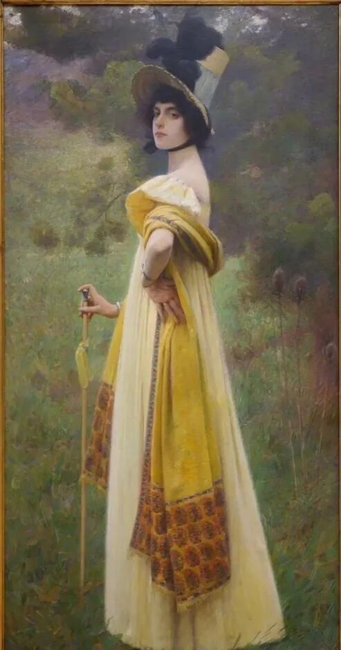 这幅画取名《披肩》,这黄白相间条纹的披肩真是太漂亮了,披着它行走在乡间的小道上,与绿草如茵互相媲美,此时的村姑显得异常颀长优雅,她仪态万方转头面对观者,其藐视一切的表情不言而喻!