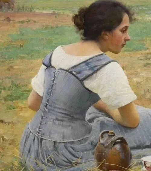 这些村姑们头顶蓝天,拿着锄头,挎着篮子,拎着水壶,整日与泥土打交道,与农田庄稼为伴,活得纯粹而干净!画家利用乡村树木农作物、绿水青山为背景,画出了她们的淳朴勤劳善良,虽然粗衣布履,没有华丽的服饰和各种珠宝作点缀,但她们浑身上下散发出迷人的魅力!