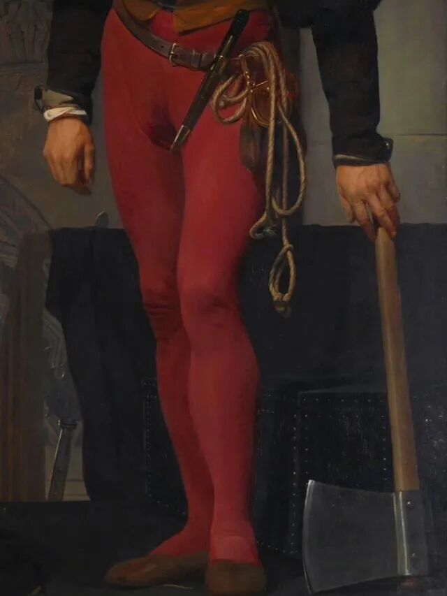 画面上描绘的是行刑的地点,那是在伦敦塔内,两个侍女在墙边无声地哭泣,女王被蒙住了双眼,神父正在指引她躺在断头台的位置,或者是临终前给她安慰吧,站在右边的是拿着斧头🪓准备行刑的绘子手!