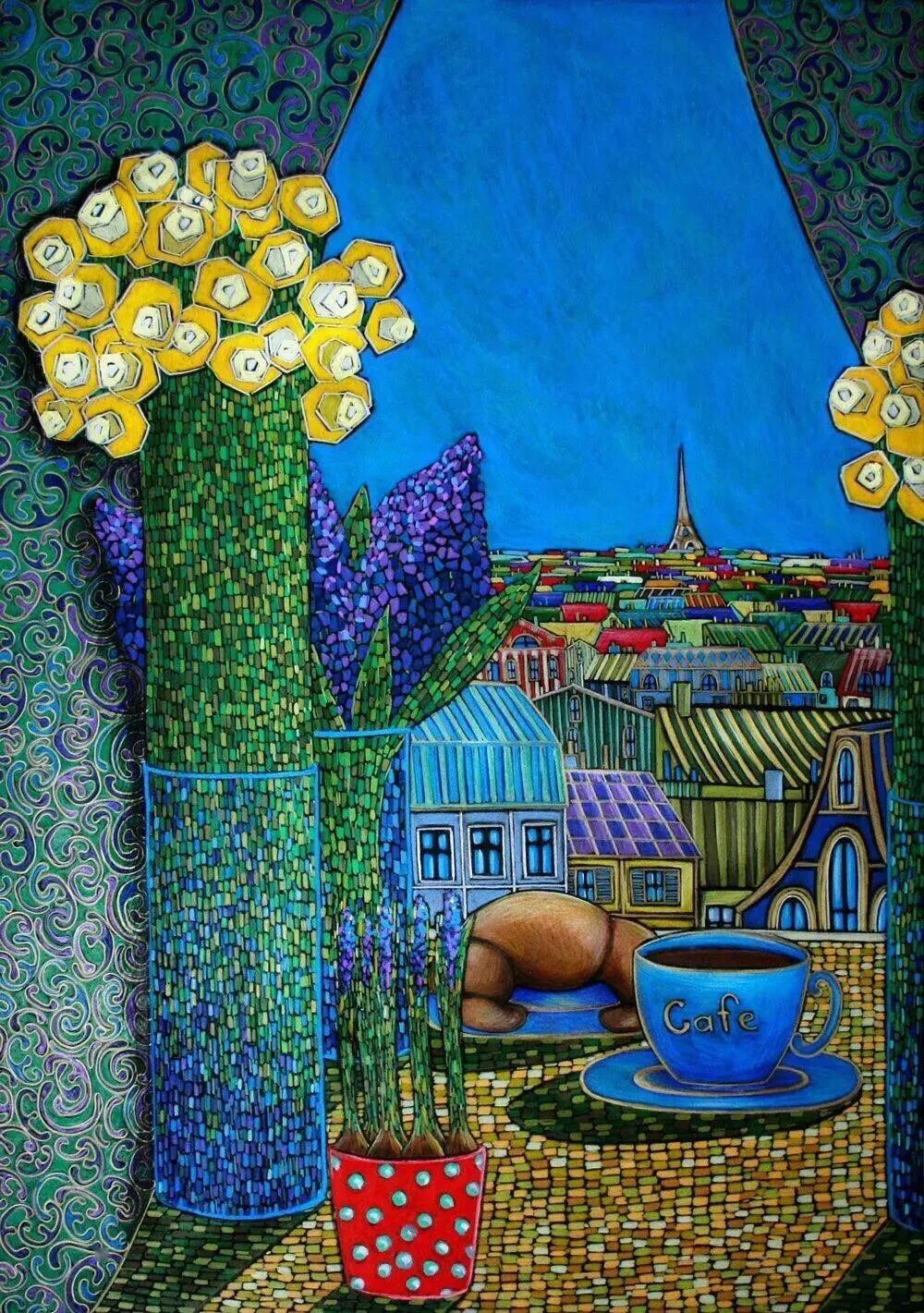 阿拉木图土地肥沃,城市南郊漫山遍野都是果园,其中苹果园最多,因此阿拉木图有“苹果之城”的美誉。附近还有自然保护区,面积约8万公顷。画家的家乡如此美丽,也使她的画作沐浴在一片大自然和阳光中!