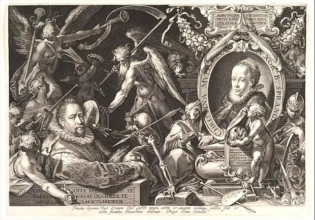 不过这位画家的家庭很不幸,他美丽的妻子,还有子女,都相继先他而去!这是他的版画《巴塞洛缪斯·斯普兰格肖像及其妻子之死的寓言》!
