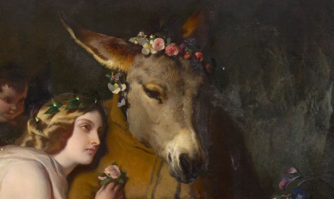 画面上的仙后泰坦尼亚因为喝下了先王给的迷情水,迷失了本性,而爱上了一个被施了魔法而变成驴脑袋的人,围观他们爱情悲剧的,还有在场的兔子🐰和仙女们!