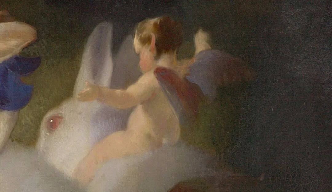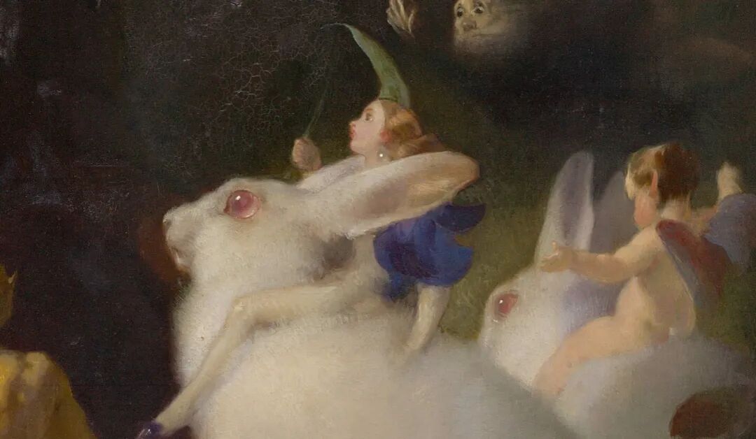 那个驴脑袋悲哀而又感伤的神情,仙后美丽动人的身影,以及仙后的白裙子,明亮的大眼睛和兔子雪白的毛发、红眼睛互相呼应,还有小天使们营造的梦境氛围,使整幅画面充满了感人至深引人入胜的故事性!
