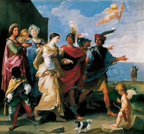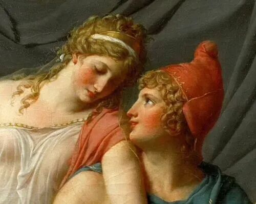 《帕里斯和海伦之爱》来自于希腊传说,讲述特洛伊王子去了斯巴达国做客,斯巴达国王盛情款待,而王子在见了斯巴达王后之后,被对方的美貌征服,于是诱惑王后,与他一起私奔,去了特洛伊城。