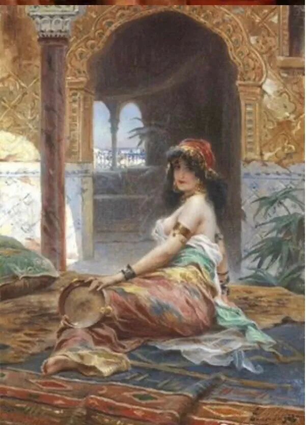 而这幅《弹竖琴的女子》,则是由法国画家阿德里安·亨利·塔鲁斯所创作!弹琴的是一位肤白貌美,美艳绝伦的风尘女子,从她头上戴的花环和侧面面对观者的坐姿,她应该是在某个闺房内,为取悦客人,而弹给某位达官贵人听!