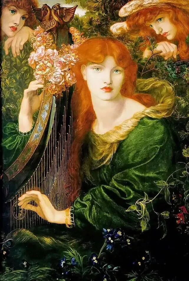 这幅是但丁·加百利·罗塞蒂创作的《弹竖琴的女子》,画面上的姑娘在百花丛中忧伤地弹着竖琴,左右两个小仙女在凝视着她,一边聆听着她哀伤的曲子!