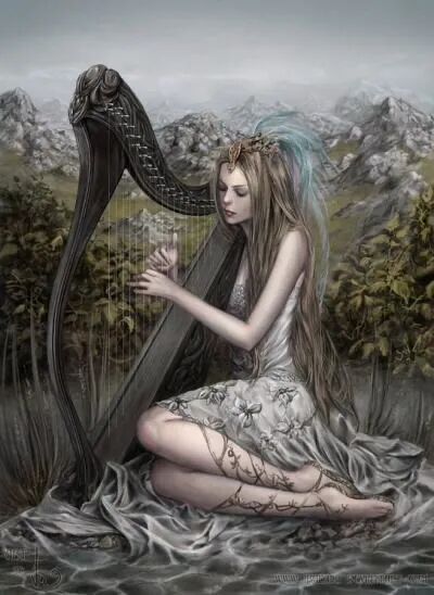 令人想起《红楼梦》中黛玉葬花的场景,哀伤、幽怨,诗意而又缠绵,因为竖琴在西方艺术家笔下一般代表爱情和性的表达!