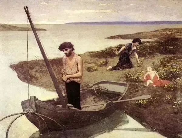 《贫穷的渔夫》,渔夫即将乘船出去捕鱼,可是他为什么这般愁苦呢,后景是他的妻子和刚出生的婴儿!生活的大海喜怒无常,渔夫也许是在担心无功而返,没有鱼儿上勾,但为了养活妻儿,只能祈求上苍,保佑自己满载而归!