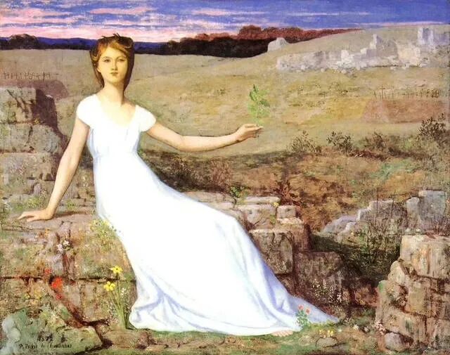 这幅《希望》,画面上一位白裙子的少女,虽然坐在荒凉的岩石上,但她手中却拿着一棵充满生命力的小草,背景是霞光万道,这一切都孕育着希望的种子!其象征着当时普法战争失败了,人们迫切向往和平的愿望,犹如画中的少女一样满怀着憧憬,期盼着未来!