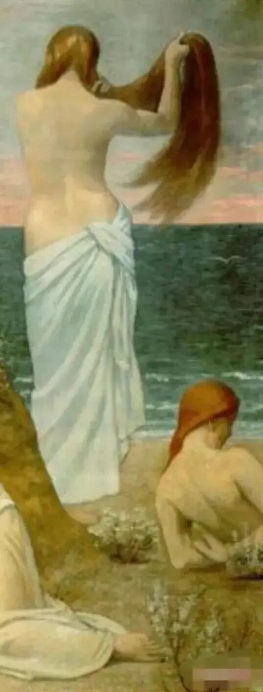 这幅《海边少女》,画面显得唯美诗意,远处霞光从遥远的地平线徐徐拉开帷幕,蓝色的海面此时显得异常平静,世界万物从晨曦中苏醒!几位少女在这样美丽的早晨,在海边梳妆,长发飘飘,犹如仙女下凡,这样的仙境,有谁不会向往呢!