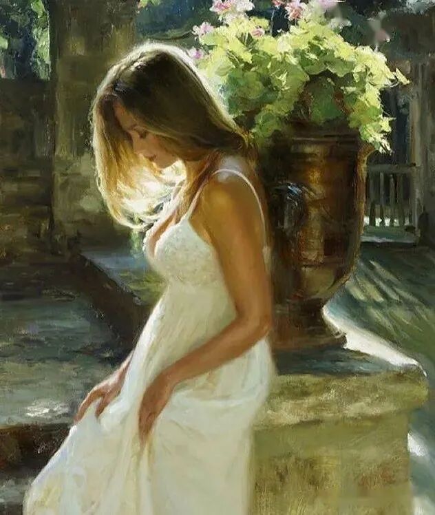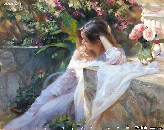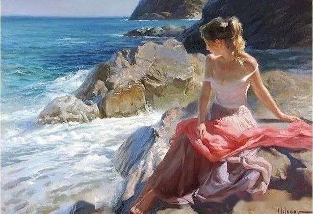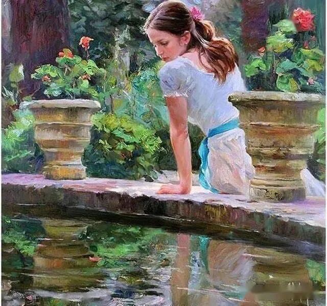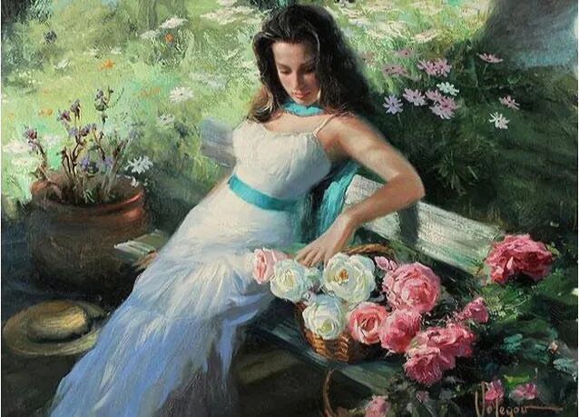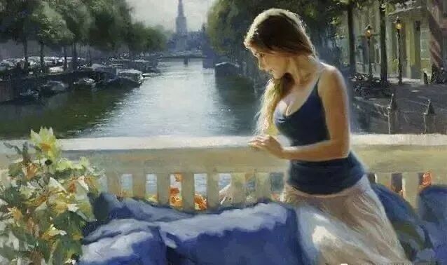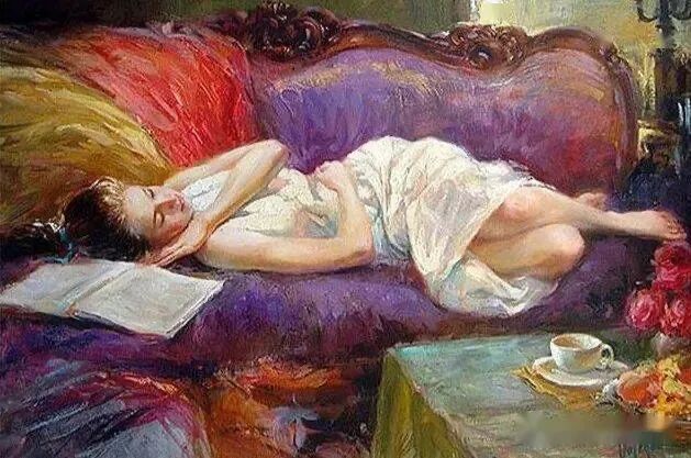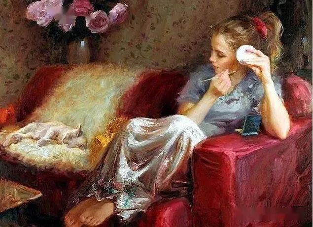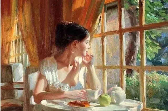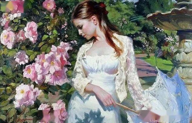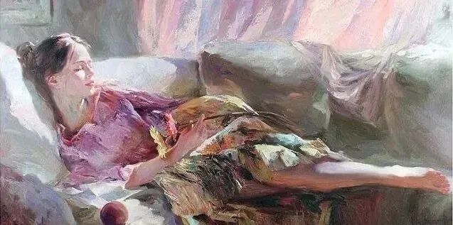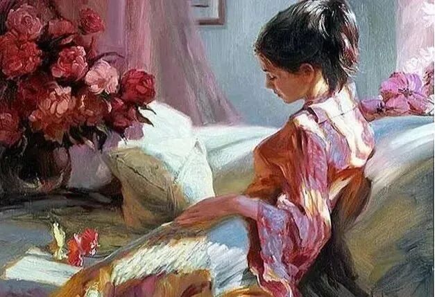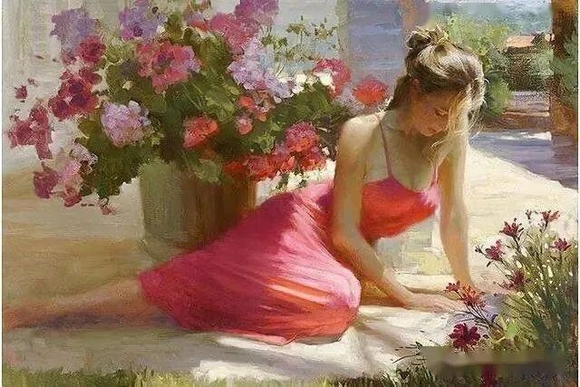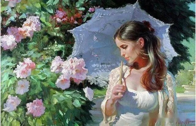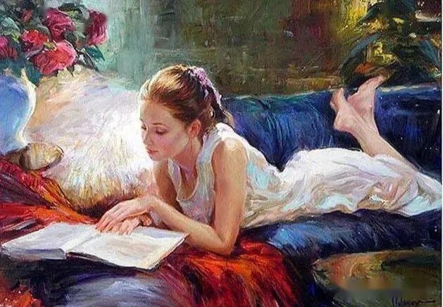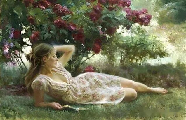 也许此时的你,也和画中的女子一样,徜徉在花丛中,或者仰卧在沙发上读书、沉思、闭目养神,或在阳台上优雅地喝茶!或者在某个风景区游玩,看花开花落,看盈盈秋水………