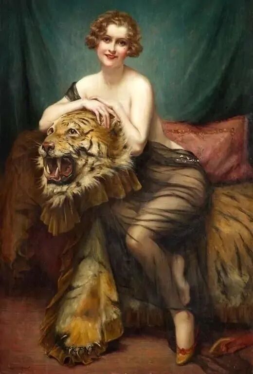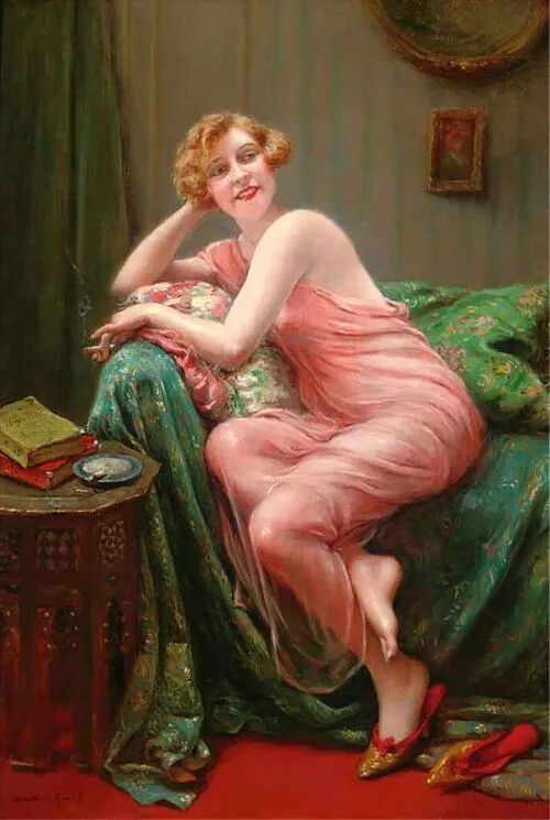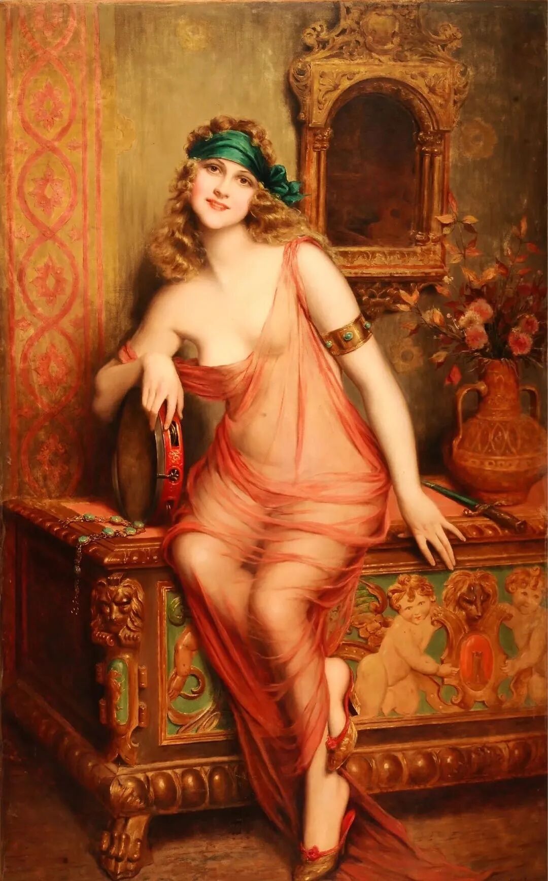 这幅是《舞蹈家》,跳舞的女子,其身材肯定是一流的,画家把她置身于一张古色古香的香妃塌上,其侧倚在靠背上的姿态,和塌下的小天使等融为一体,更显得风姿绰约,犹如仙女下凡!
