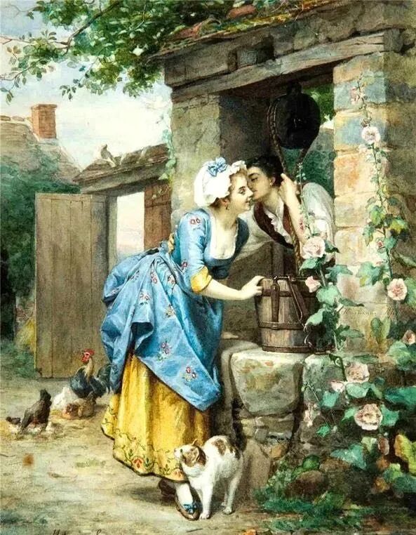 在井边的邂逅,有人理解为偷情,因为女子穿着华丽,似乎是大户人家的小姐,而小伙子则显得很寒酸,看起来是一位初涉爱河的文艺小青年,画面感觉是偷偷摸摸的约会!有身旁的老猫、几只觅食的母鸡,还有一口老井为这对有情人作为爱的见证!