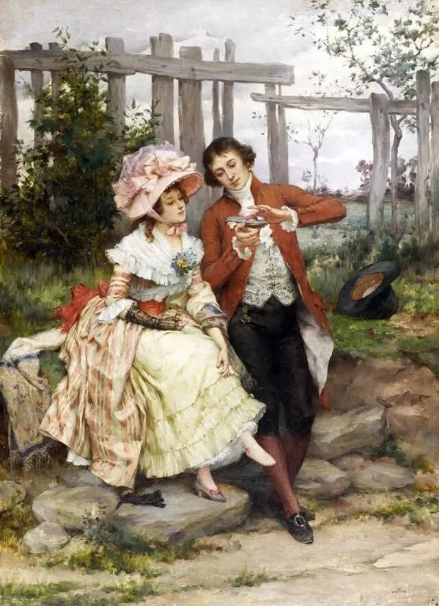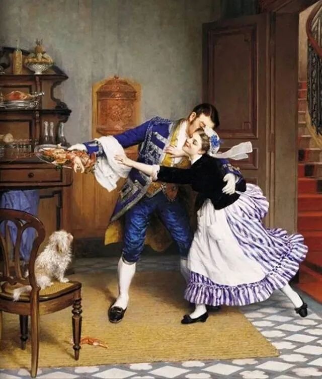 这偷偷的甜蜜的激情的一吻,画家把这对男女手和脚的夸张动作,这一戏剧性的场景,刻画得惟妙惟肖,入木三分,如身临其境!