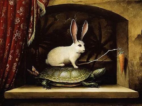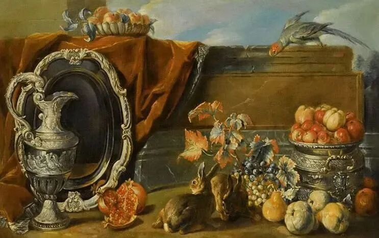 亚历山大.弗朗索瓦画作《静物与两只兔子》,上面的飞鸟与下面的两只兔子遥相呼应,使整幅画面变得生机盎然!