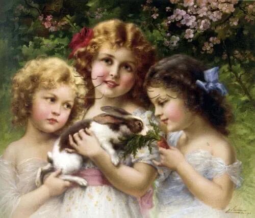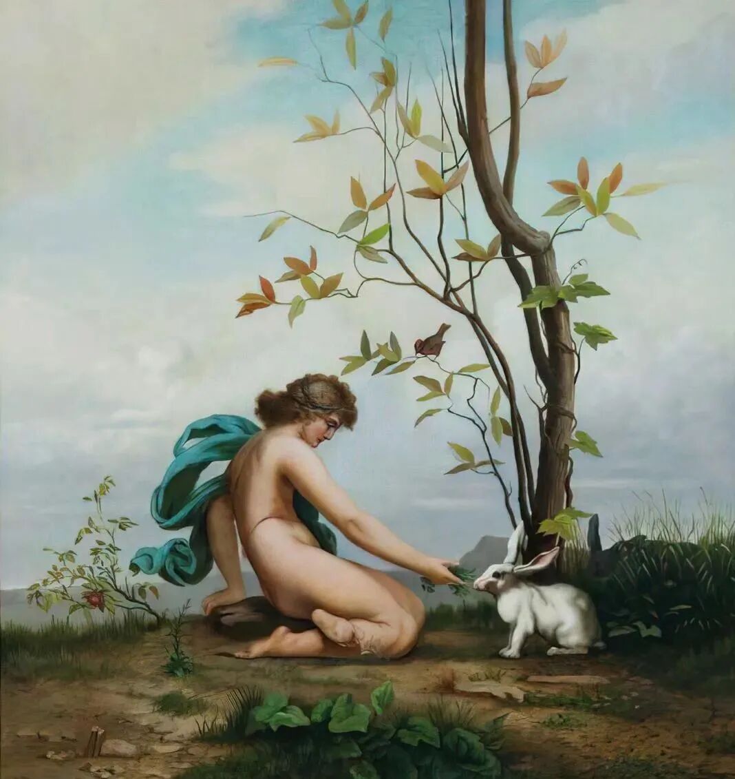查尔斯·普罗斯《古典美人与兔子》,创作于十九世纪,收藏于加利福尼亚艺术馆。画面上兔子与美女的亲热互动,与周围的树木、青草地、蓝天白云互相辉映,相得益彰,体现了只有人与自然和谐共处,才能拥有这美好一切的主题思想!