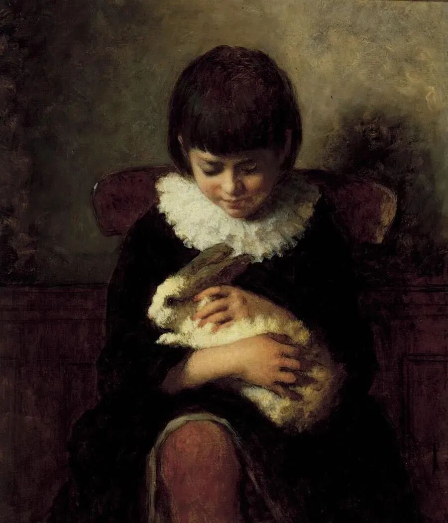 伊士曼.约翰逊画作:《女孩与兔子》,又取名坐在椅子上抱着兔子的女孩!