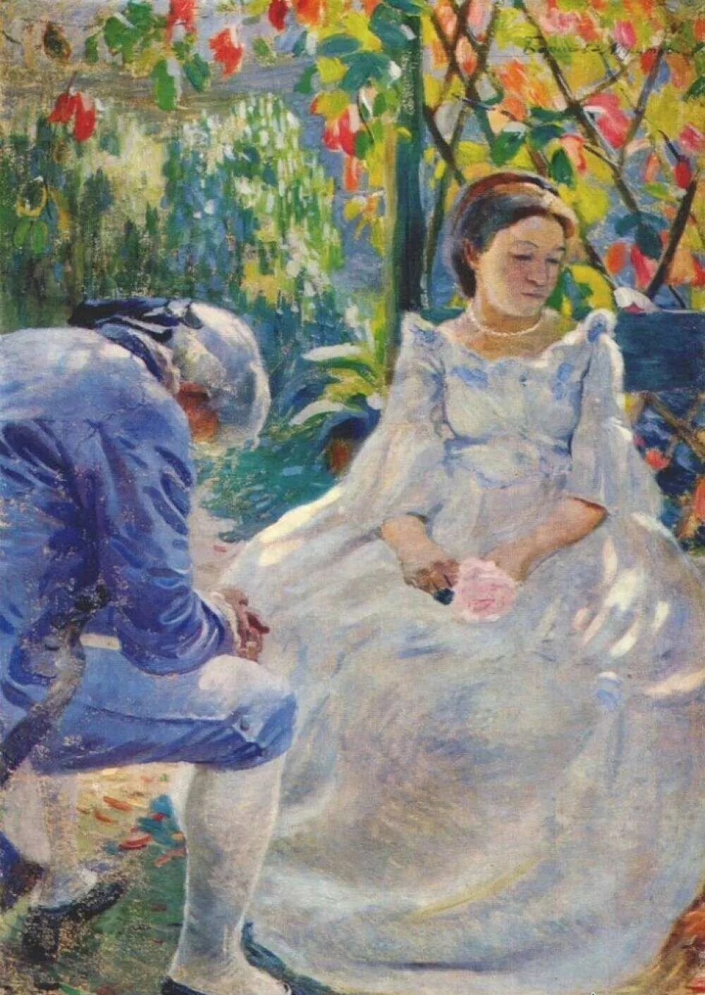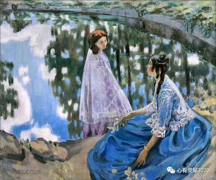 这幅是俄罗斯印象派画家维克托·埃尔皮迪弗罗维奇· 鲍里索夫-穆萨托夫所画的《池塘》!画中人物是他的妹妹和她的新娘,两位美女在池塘边互相对望着,和水中的树木、蓝天白云互相辉映,和她们的蓝色和白色衣裙和谐搭配,互相融合在一起,其诗情画意的意境相当优美!