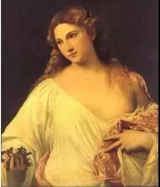 提香·韦切利奥《花神》,手捧盛开的鲜花,以侧立之姿态面对观者,显得风姿绰约!
