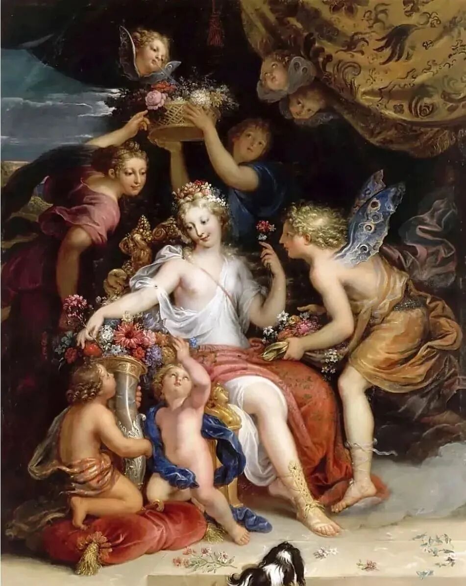 十七世纪法国画家米歇尔·科尼尔创作的《仄费洛斯与芙罗拉》,背上有一对翅膀的就是西风之神,他给她情人芙罗拉带来了很多鲜花,而周围的小天使们都在忙着拿大口袋装五颜六色的花朵!画面和谐温馨,充满了浪漫主义情怀!