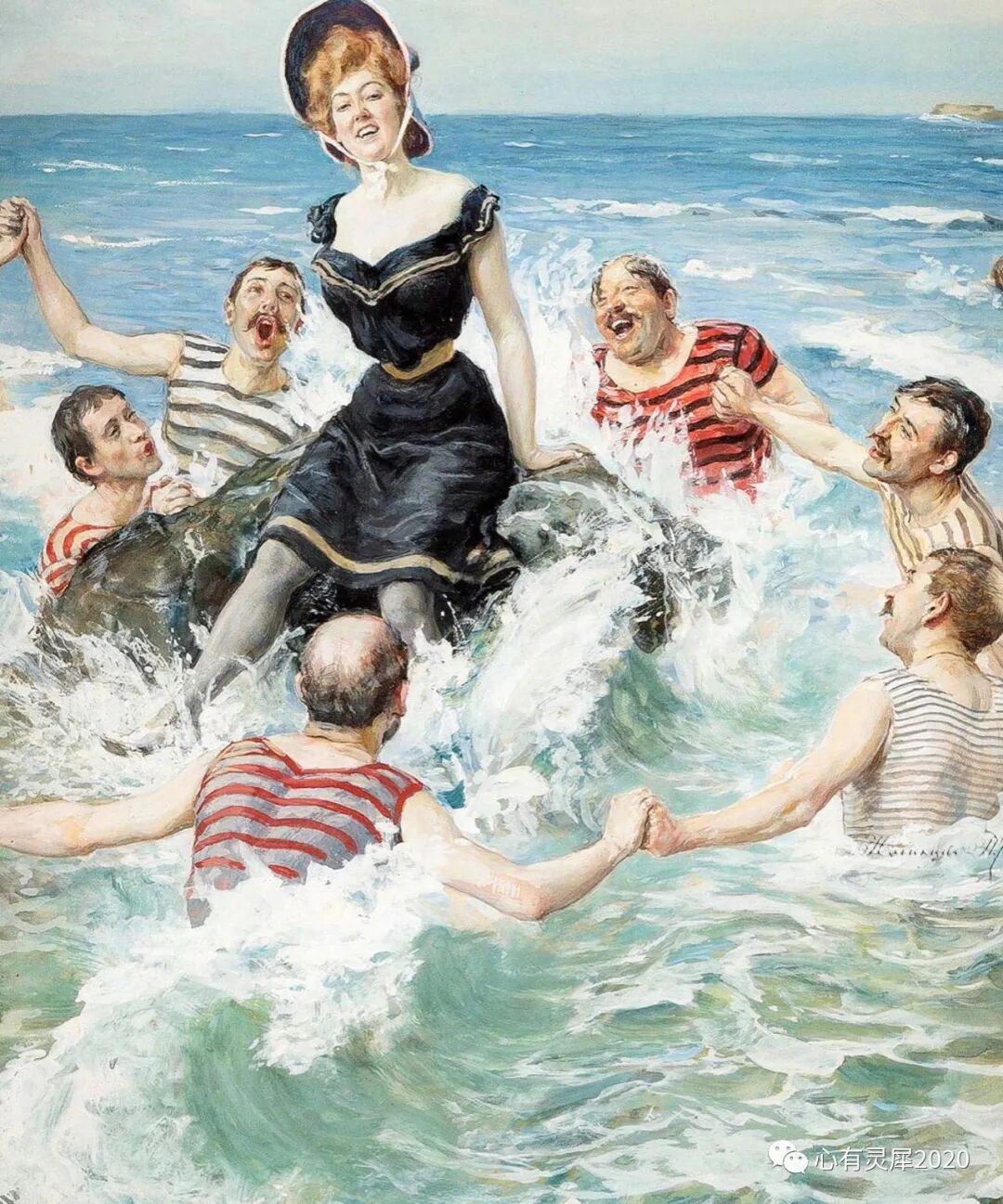 六位男士围绕着一位女神,在水中嬉戏,这么有魅力啊!众星捧月,追求者这么多……