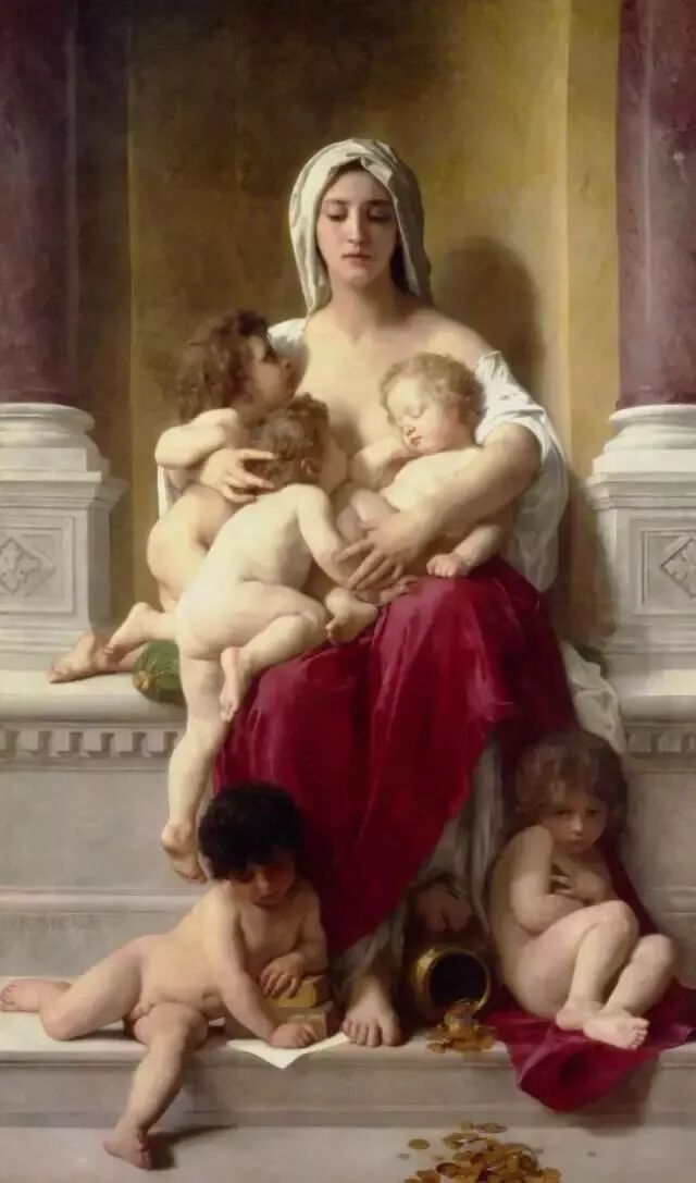 阿道夫·威廉·布格罗创作的《慈善》,则是把女人形象上升到了另一个伟大的角度,那就是母亲,伟大的母爱,这是创造世界的源泉!这并非只是慈善,而是女人从内而外散发出来的爱的光芒,是一种无私的奉献精神!
